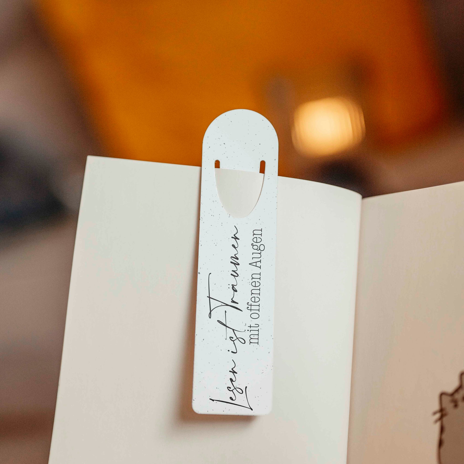 Lesezeichen aus Aluminium mit Spruch Lesen ist träumen mit offenen Augen